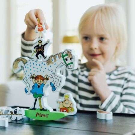 Med dette sjove balancelegetøj af træ kan Pippi bære alt hvad hun støder på. Stabl sammen – se hvor mange stykker du kan balancere med inden det vælter. Indeholder 12 stykker af træ, som er lige så sjove at lege med frit som at balancere med.