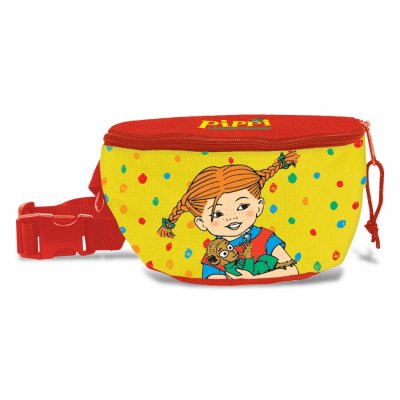 Bæltetaske til børn med Pippi Langstrømpe motiv. Kan også bæres over skuldrene. Tasken har et lynlås monteret rum på bagsiden, perfekt til opbevaring af værdigenstande i.