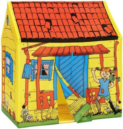 Et legetelt er en succes hos alle børn. Dette legetelt er formet som Pippis hus. Leg fjollede Pippi-lege eller find favorithistorien frem og hyg jer lidt i det lille hus! Gå ind og ud gennem stofdøren eller rul den op og fastgør den med båndene. Du kan også rulle gardinerne op i de tre vinduer. Legehuset har også et gulv af stof. Villa Villekulla som legetelt er en succes både i børneværelset og i haven – måske et gemmested når barnet leger gemmeleg? Pippiteltet er nemt at sætte op og tage ned.