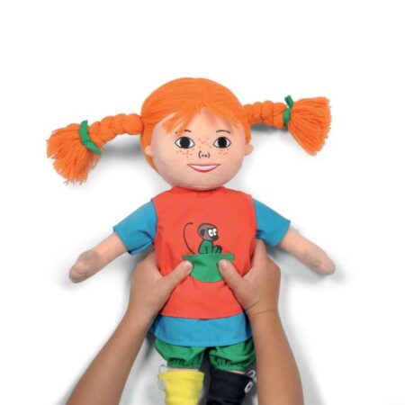 Den bløde Pippidukke siger 11 sjove Pippicitater, når du trykker hende på maven. Hun taler 6 sprog: svensk, norsk, dansk, finsk, engelsk og tysk, og du kan nemt skifte sprog via en regulering på taleværket i dukkens ryg. Taledukken er 40 cm lang, blød og krammevenlig og tager gerne med på tingfinder-jagt og andre skøre eventyr!