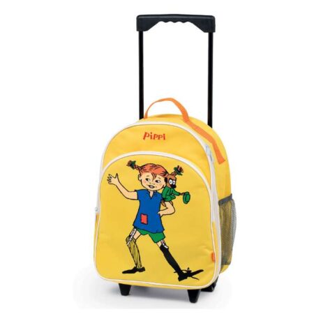 Vil barnet ud i verden lige som Pippi Langstrømpe? Dette er en gul Pippirejsetaske på hjul med plads til alt hvad barnet behøver for et eventyr! Den er tilpas stor til en lille som gerne vil rulle selv, og hvis barnet bliver for træt, kan en voksen bære den som en rygsæk ved hjælp af skulderremmen. Tasken har et stort rum og to mindre samt et navneskilt på bagsiden. Kufferten findes også i lyserød.