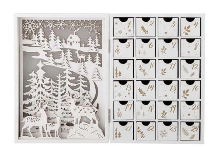 Sød julekalender og pakkekalender med 24 små skuffer og flotte dekorationer og lys. Perfekt til juledekorationen og til søde små overraskelser i den kolde tid.