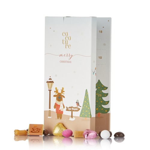 Smuk og elegant julekalender formet som en julekrans. Hver dag finder du 2 stykker chokolade, hvilket gør den oplagt at dele. Chokoladerne har forskellige fyld som karamelsauce, blød ganache og nougat, der tilsammen byder på en varieret og smagfuld oplevelse.