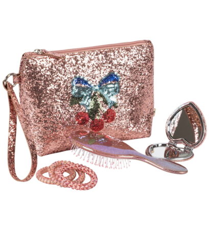 Smuk Konges Sløjd-toilettaske i en glitrende lyserød farve. Tasken er pyntet med et dekorativt pailletmotiv af sommerfugle og kirsebær, som giver et unikt touch til designet. Sættet inkluderer en hårbørste, et håndspejl og tre hårelastikker.